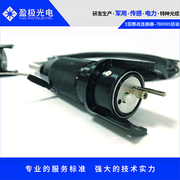 2芯野戰(zhàn)光纜活動連接器TBE-005的一端與快速連接器連接,另一端為高精度的FC/SC/ST等連接頭與光電子設(shè)備連接。