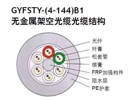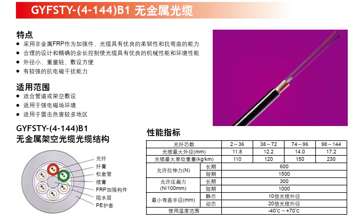 特點:采用非金屬FRP作為加強件,光纜具有優(yōu)良的柔韌性和抗彎曲的能力