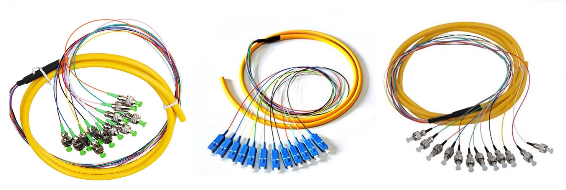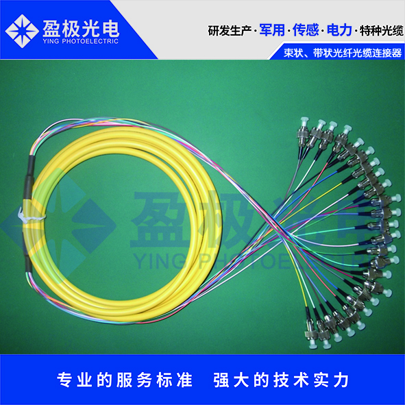 束狀、帶狀光纖光纜連接器組件,以稱分支光纜組件、分支光纜尾纖等,可以加工成為一端為連接頭,也可加工兩端連接頭,常出現(xiàn)在光纖終端盒內(nèi)容,用于連接光纜與終端設(shè)備。尾纖分為多模尾纖和單模尾纖。多模尾纖為橙色,波長為850nm,傳輸距離為500m,用于短距離互聯(lián)。單模尾纖為黃色,波長長有兩種,1310nm和1550nm,傳輸距離分別為10km和40km。由4、6、8、12、24等不同根數(shù)組成。