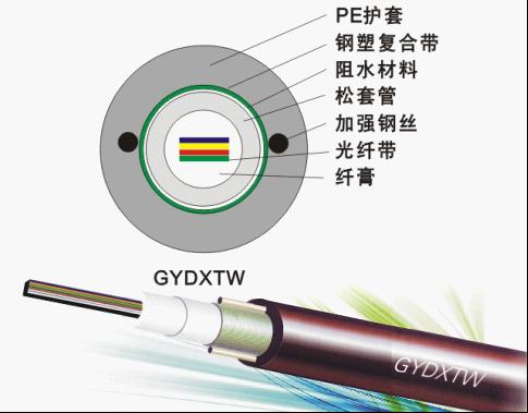 GYDXTW光纜的結(jié)構(gòu)是將單?;蚨嗄9饫w套入由高模量的塑料做成的松套管中,套管內(nèi)填充阻水化合物。松套管外用雙面涂塑(皺紋)鋼帶縱包,鋼帶和松套管中間的阻水帶保證了光纜的緊湊和縱向阻水,兩側(cè)放置的兩根平行鋼絲加強(qiáng)后護(hù)套成纜。