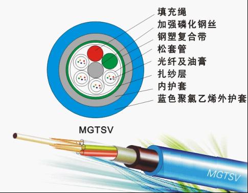 標(biāo)準(zhǔn)礦用阻燃綜合光纜(MGTSV)的結(jié)構(gòu)是將單?;蚨嗄9饫w套入由高模量的塑料做成的松套管中,套管內(nèi)填充阻水化合物。纜芯的中心是一根磷化鋼絲,松套管(或填充繩及信號(hào)線)圍繞中心加強(qiáng)芯絞合成緊湊和圓形的纜芯,纜芯內(nèi)的縫隙以阻水填充物,聚乙烯內(nèi)護(hù)套后,藍(lán)色阻燃PVC護(hù)套成纜。